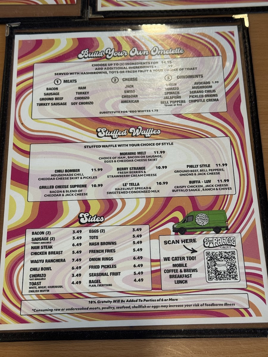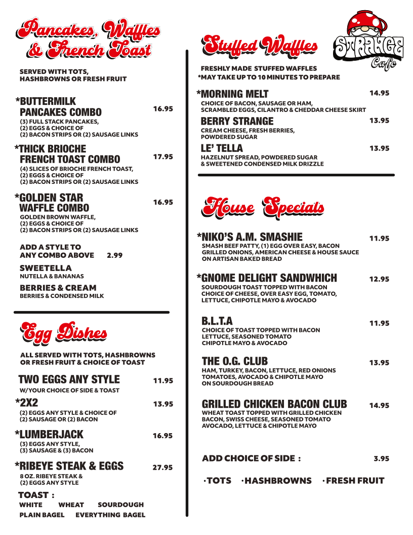The menu features a variety of breakfast, brunch, and American-style dishes, suitable for mornings and midday meals. It includes a selection of stuffed waffles with different fillings such as cheese, bacon, and seasonal berries, offering both savory and sweet options.